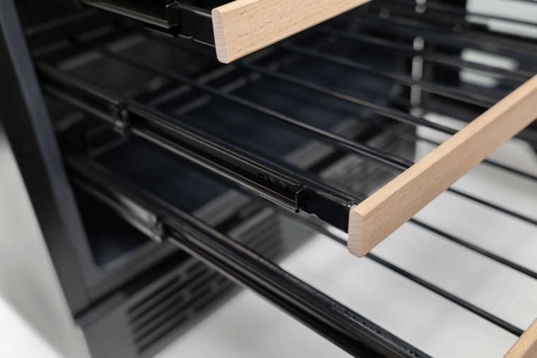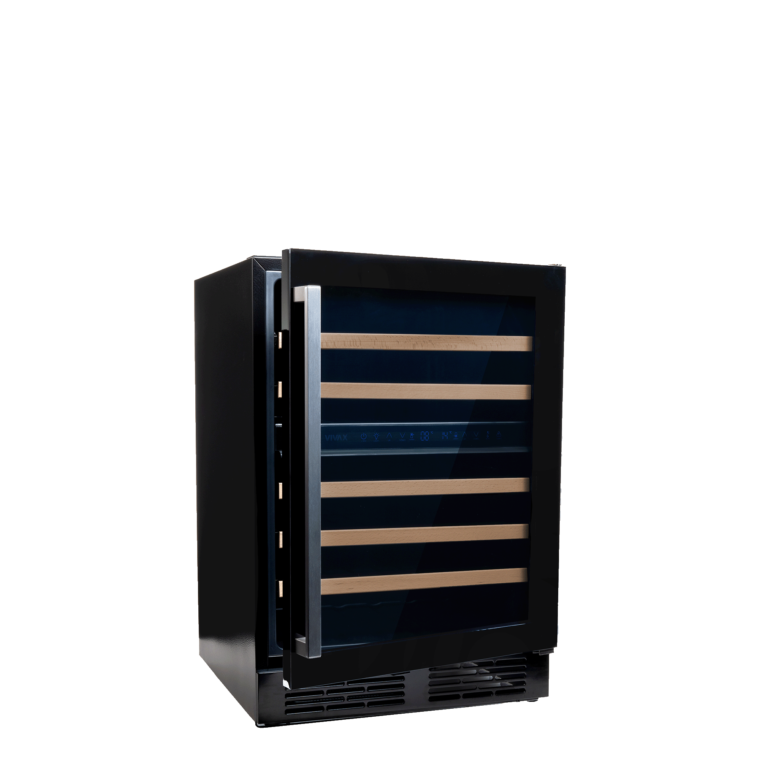 Elegancës së dizajnit i kontribuon edhe dera e frigoriferit prej xhami të errët me filtër UV, e cila kontribuon në ruajtjen e verës dhe mbi të cilën bie në sy doreza tërheqëse e inoksit.